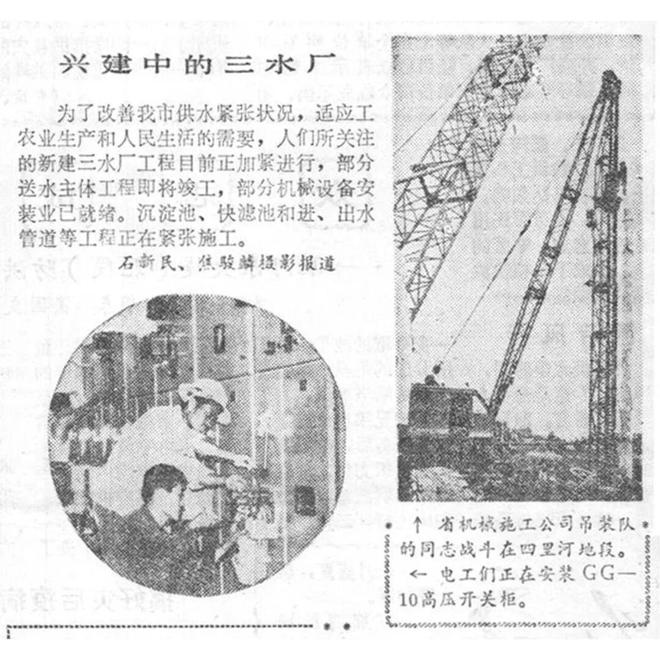 1980年1月12日,市革委会发出加快三水厂建设的会议纪要,确定当年“八一”实现部分投产,并加强组织领导。3月,各方面施工力量云集工地,三水厂工程会战开始。不巧在4月以后遇上了50多天的连绵阴雨,给施工造成很大困难。建设者日夜奋战在泥泞的工地上,终于在8月1日使三水厂按期实现部分投产送水……